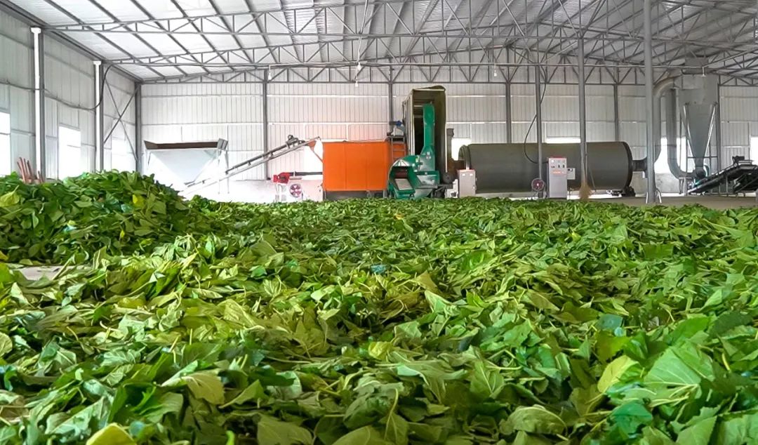 “目前安裝了1條生產線,滿負荷生產時,每日可烘干加工鮮桑葉100余噸。自投產以來,除惠民鎮外,周邊漁門、永興等鄉鎮桑葉源源不斷聚集,市場比我們預想更為火熱。”汪水忠看著堆積如山的桑葉介紹道,從鮮葉收購運到倉庫,經過切割、烘干等一系列工序,最后這些干桑葉將集中運輸到公司總部深加工為人工智能化飼料喂蠶。
