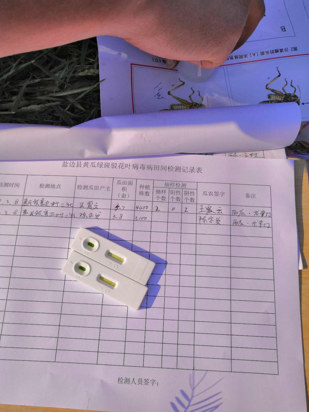 該病毒來源于種子帶菌,年初(1月6至10日),我局植物檢疫人員檢查了鄉(xiāng)鎮(zhèn)市場(chǎng)銷售的葫蘆科包裝種子并查看了西瓜育苗大棚,未發(fā)現(xiàn)黃瓜綠斑駁花葉病毒病癥狀。為確保西瓜安全生產(chǎn),省植物檢疫站特意下發(fā)了檢測(cè)試紙條,用于開展瓜田檢測(cè),防患于未然。
