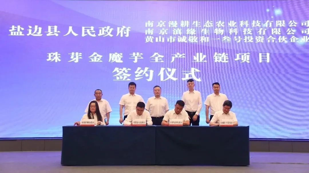 5月14日,鹽邊縣人民政府與南京漫耕生態農業科技有限公司、南京滇緣生物科技有限公司、黃山市誠敬和一叁號投資合伙企業舉行珠芽金魔芋全產業鏈項目合作協議簽約儀式。