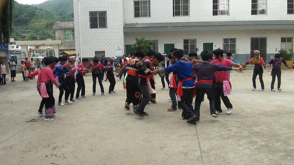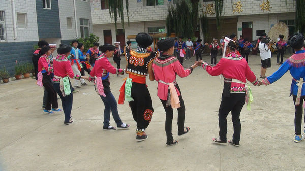 鹽邊縣和愛鄉及其周邊的紅彝,他們的祖先是明末清初從云南遷入四川的。“紅彝蹀腳舞”(又稱“踢腳舞”),是紅彝口傳身授一代一代流傳下來的一種集體舞蹈。婚、喪、嫁、娶、生產勞作、修房造屋、節日慶典等重要活動,人們都要聚在一起跳“蹀腳舞”。舞蹈時大家手拉手圍成圓圈,兩手上下甩動、跺腳、蹺腳、打合腳,甩手蹀腳,模仿“挖生地、背榨把、馬踢腳…”等動作,匯集了紅彝的打跳舞、豐收舞、拍手舞、迎客舞及“云南腳”、“姑娘腳”、“七腳”、“斑鳩吃水”、“蒼蠅搓腳”等步法,以竹笛伴奏,同時將山歌對唱融入舞蹈中,地方色彩濃郁。紅彝蹀腳舞由十三段舞曲組成。第一段大家樂,第二段小哥在云南、小妹在四川,第三段閃閃腳,第四段腳踢腳,第五段花兒開,第六段三步合腳,第七段龍擺尾,第八段背榨把,第九段大姨媽趕街,第十段對腳兩面三腳,第十一段彝山腳下,第十二段步步響,第十三段歡樂舞。調式明快,多四二拍與四三拍混合組成曲子,曲調或高亢激烈,或婉轉回旋,節奏時而緊迫、時而緩慢,舞者按曲調變化緊緊相隨,不斷變換動作和步伐,具有本民族鮮明的藝術個性和濃郁的地方特色。