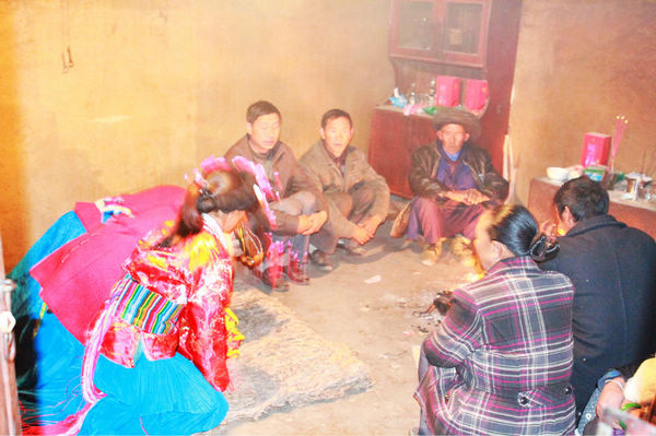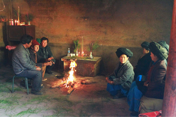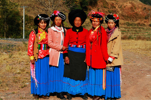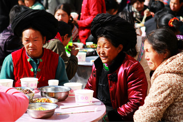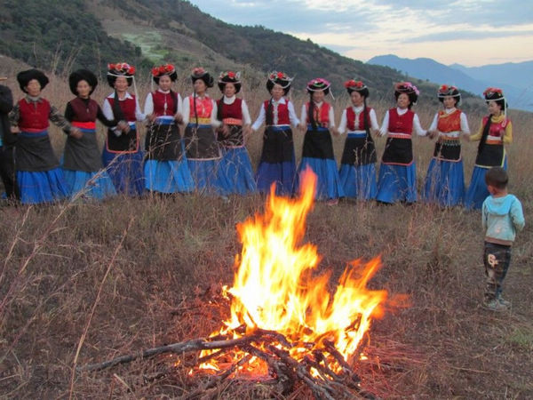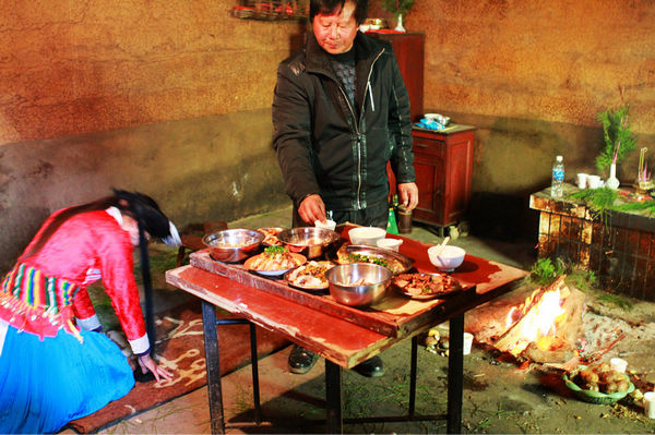 迎娶:按照達巴擇定的“吉日”,男家殺豬宰羊,做好米花糖、豬膘肉、麻糖、釀好白酒、糯米甜酒、炒瓜子花生等,堂屋地上鋪好綠松毛,臺階上用青枝綠葉搭一個“親棚”,吊一個裝有錢幣的紅綢繡球,院中央栽兩棵青松。男家叔叔帶領四個鼓手、六人敲鑼打鼓,親戚和青年人組成迎親隊伍,抬上禮品吹吹打打到女家,到女家村口時放三聲火槍告之。女家人把迎親隊伍接住,敬獻米花、麻糖、煙、酒、茶等,迎親客人吹葫蘆笙圍繞松樹歌舞三圈,迎親隊稱“行媒”,送親隊稱“坐媒”,在長桌席對坐入席。入夜在院中圍篝火“打跳”(鍋莊舞)。
