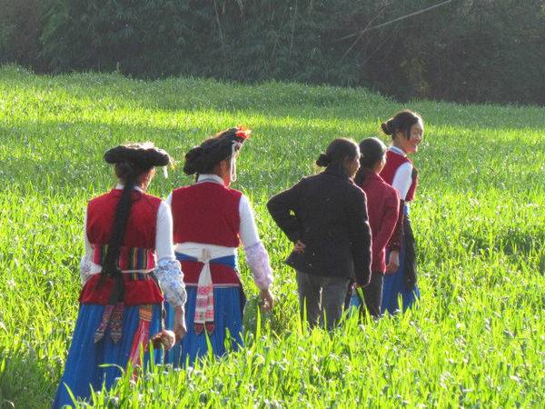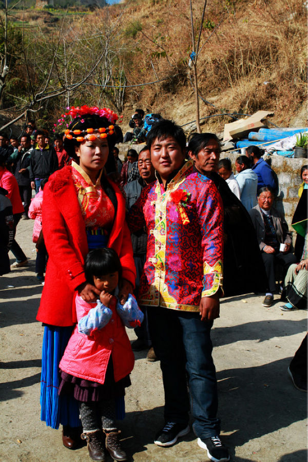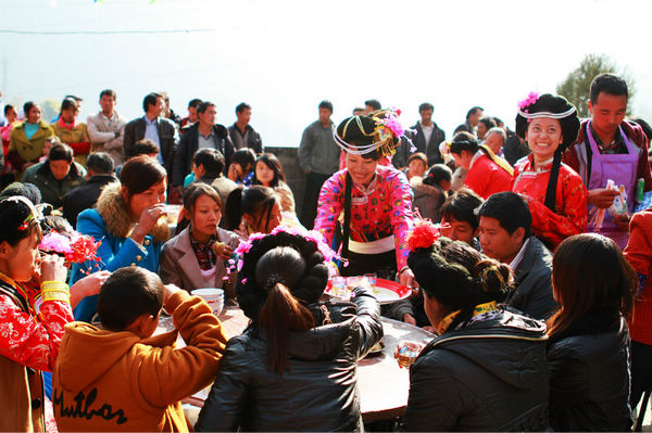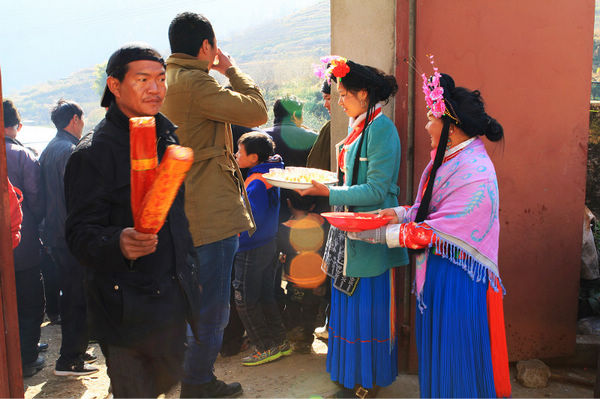 第二天翌晨,新娘叩拜祖先,告別父母后,由哥哥抱出堂屋,背到馬前抱上白馬(婚馬),男女兩家各派一角力“爭馬頭”,勝者獲得繡球中的錢幣和女家老人敬的三杯酒。送親男客捧上陪奩掌盤,火槍齊鳴,笛和葫蘆笙齊奏,簇擁新娘向男家走去。若兩家是同村的,隊伍要在山道上繞行。進入男家,新郎攔住馬,牽馬入院,行媒按男左女右入座,先由新郎父母敬酒一巡,再由新郎叔叔敬酒一巡,接著親戚們輪番敬酒夾菜,并接受一對新人敬的“孝敬酒”。傍晚在院壩中的篝火旁唱歌跳舞、摔跤、扳手勁、扭扁擔等通宵達旦。