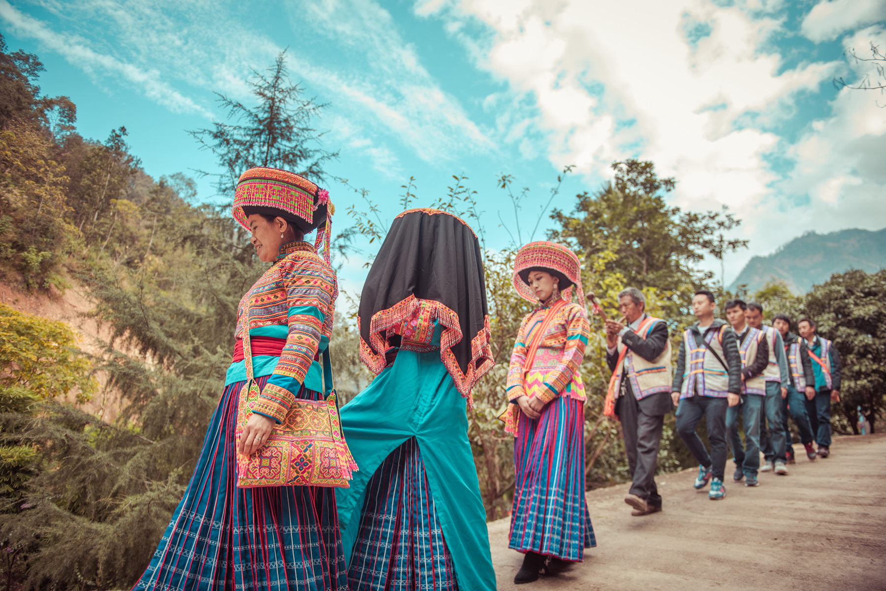 婚禮講究無媒不成婚,所以從提親到婚禮都須請“瓦拉帕”(媒人)主持(分正、副),為男性,世代相傳。迎親時還需 “瑪妞木帕”(奏葫蘆笙者)、“輔此帕,輔此瑪”(接新娘的夫婦)及“瓦拉哲巴”(迎親兄弟)6位組成迎親隊伍,另需請“尼帕”作法。