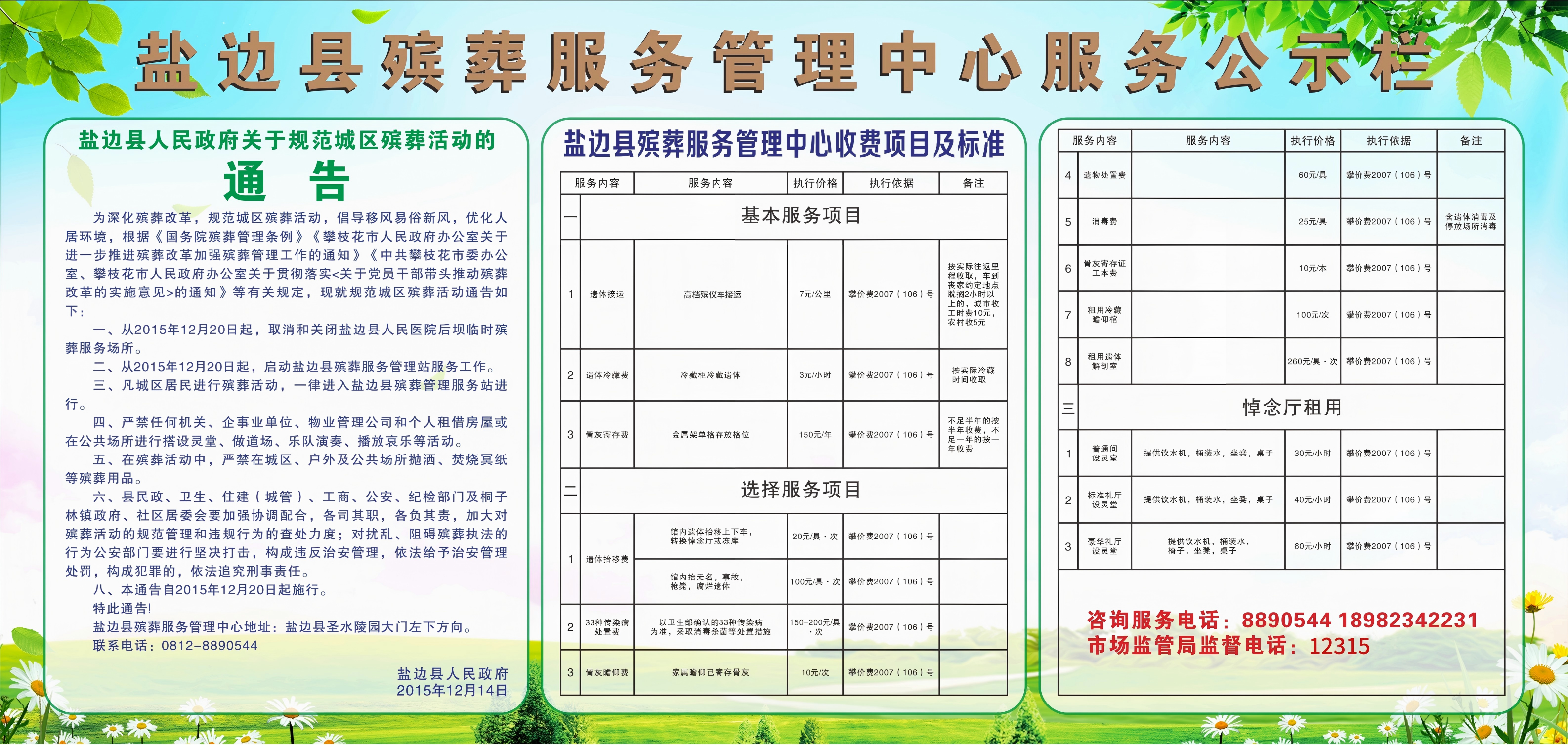 為進一步加強我縣殯葬服務管理,規(guī)范殯葬服務價格行為,提升殯葬服務水平。現(xiàn)結合殯葬工作實際,將鹽邊縣殯葬服務中心和鹽邊縣干箐溝圣水陵園收費項目及收費標準予以公示,接受社會監(jiān)督。