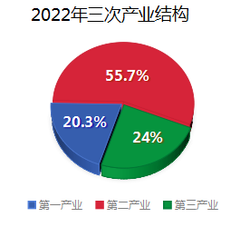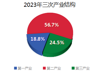 根據地區生產總值統一核算初步結果,2023年鹽邊縣地區生產總值(GDP)169.6億元,按可比價格計算,比上年增長6.5%。其中,第一產業增加值31.8億元,增長4.1%,對經濟增長的貢獻率為13.9%,拉動經濟增長0.9個百分點;第二產業增加值96.2億元,增長6.3%,對經濟增長的貢獻率為52.8%,拉動經濟增長3.4個百分點;第三產業增加值41.6億元,增長9%,對經濟增長的貢獻率為33.3%,拉動經濟增長2.2個百分點。三次產業結構由上年的20.3:55.7:24調整為18.8:56.7:24.5。