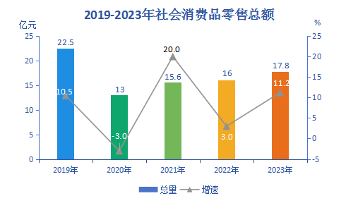 全年實現社會消費品零售總額17.8億元,比上年增長11.2%。按銷售單位所在地分,城鎮零售額15.8億元,同比增長10.1%;鄉村零售額2億元,同比增長20.5%。按行業分,批發業1億元,同比增長6.3%;零售業14.4億元,同比增長12.3%;住宿業0.3億元,同比增長0.7%;餐飲業2.1億元,同比增長8.4%。