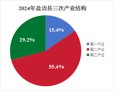 根據地區生產總值統一核算初步結果,2024年鹽邊縣地區生產總值(GDP)191.2億元,按可比價格計算,比上年增長7.5%。其中,第一產業增加值29.4億元,增長3.5%,對經濟增長的貢獻率為8.8%,拉動經濟增長0.7個百分點;第二產業增加值106億元,增長7.9%,對經濟增長的貢獻率為55.7%,拉動經濟增長4.1個百分點;第三產業增加值55.8億元,增長9.2%,對經濟增長的貢獻率為35.6%,拉動經濟增長2.7個百分點。三次產業結構由上年的16.9:54.3:28.8調整為15.4:55.4:29.2。
