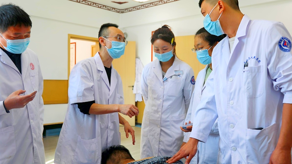 吳楊一邊在診療室的各個床位間穿行,為就診者進行推拿、扎針等治療,一邊根據就診者的身體狀況,向縣人民醫院的中醫師們講解診療時的注意事項,整個診療過程有條不紊地開展著。