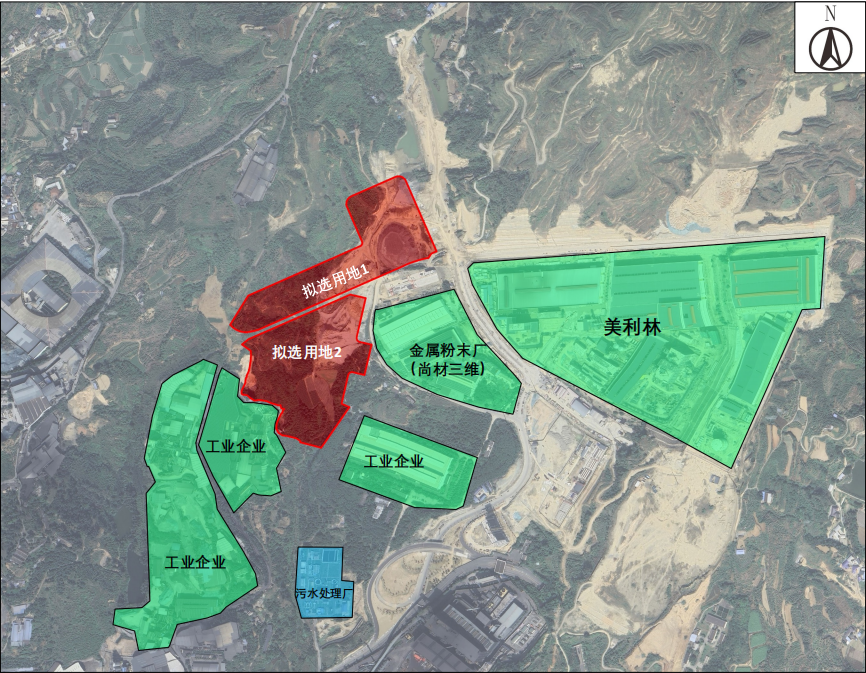 本次擬選址論證范圍位于鹽邊釩鈦產(chǎn)業(yè)開發(fā)區(qū),共2個地塊,用地西側(cè)為美利林(釩鈦耐鑄造產(chǎn)業(yè))。地塊1用地面積68164.43㎡(約102.25畝),東南區(qū)域處有一趟10kv輸電線線路;地塊2用地面積77577.17㎡(約116.37畝),現(xiàn)有4趟高壓輸電線(一趟220kv、一趟110kv、一趟35kv、一趟10kv)。