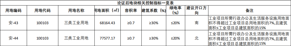 論證后擬確定地塊1編碼為安-43,用地面積為68164.43㎡(約102.25畝),用地代碼100103(三類工業(yè)用地),容積率≥0.7,建筑系數(shù)≥30%,綠地率≤20%,建議開口方向為南側(cè),工業(yè)項目所需行政辦公及生活服務(wù)設(shè)施用地面積不得超過工業(yè)項目總用地面積的7%,且建筑面積≤工業(yè)項目總建筑面積的15%。