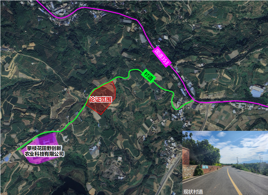 項目用地位于紅格鎮鲊石村,論證地塊西南方250m處為攀枝花田野創新農業科技有限公司,周邊為耕地和園地,分布有少量居民點,周邊無易燃易爆場所。緊鄰國道353,地塊西北側有一條村道(寬度約6m)聯系國道,距離紅格鎮區約4km,與宜攀高速出入口間距約2km,交通便捷。
