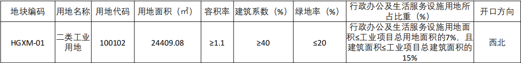 論證后地塊編碼為HGXM-01,用地面積為24409.08㎡,用地性質為二類工業用地,用地代碼:100102,容積率≥1.1,建筑系數≥40%,綠地率≤20%,行政辦公及生活服務設施用地面積≤工業項目總用地面積的7%,且建筑面積≤工業項目總建筑面積的15%,建議開口方向:西北。