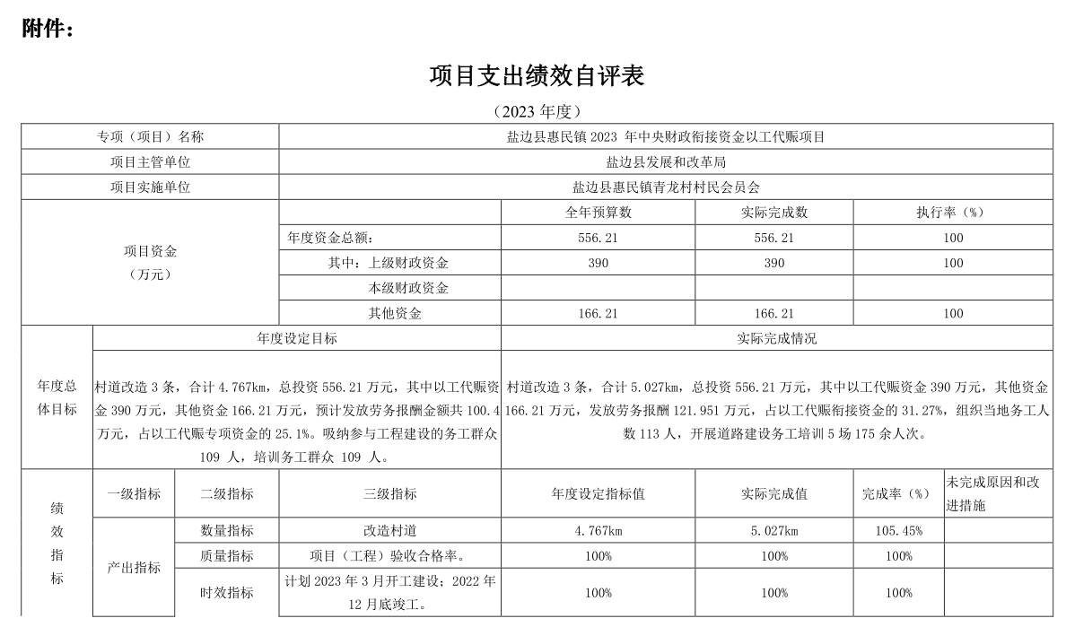 附件:鹽邊縣惠民鎮2023年中央財政銜接資金以工代賑項目支出績效目標自評表