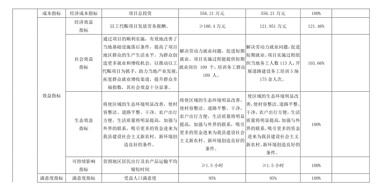 鹽邊縣惠民鎮2023年中央財政銜接資金以工代賑項目:項目涉及村道改造3條,合計4.767km,項目總投資556.21萬元,其中:中央財政銜接資金390萬元,其他資金166.21萬元。該項目嚴格按以工代賑要求,由村民委員會為業主采用村民自建的方式組織實施,成立項目理事會,并下設施工管理組、質量監督組、財務管理組、材料采購組、物資保管組、檔案收集組等6個小組。項目已完工并完成縣級驗收,資金已撥付完畢?,F將目標績效完成情況予以公告。