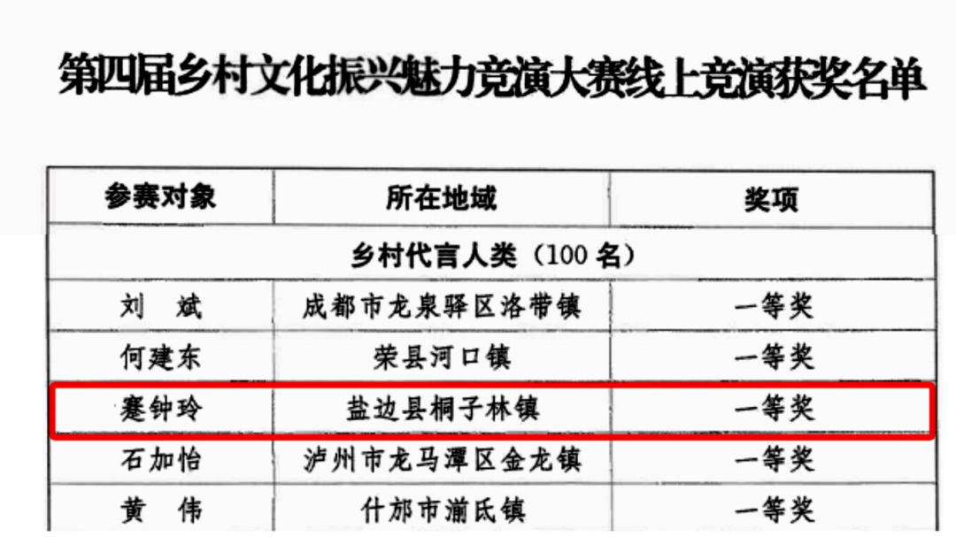 近日,中共四川省委宣傳部等部門聯合發布了《關于四川省第四屆鄉村文化振興魅力競演大賽獲獎單位和個人的通報》,鹽邊縣桐子林鎮短視頻創作者、旅行博主蹇鐘玲榮獲四川省第四屆鄉村文化振興魅力競演大賽線上競演鄉村代言人類一等獎。