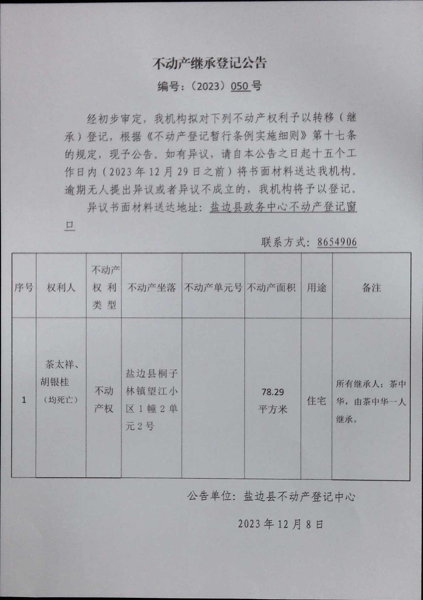 不動產繼承登記公告(2023)第050號