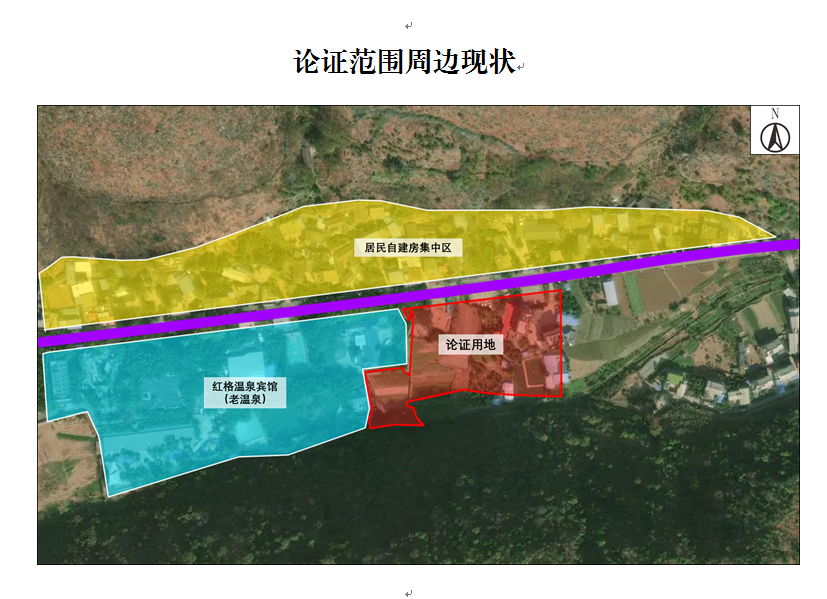 本次論證用地位于鹽邊縣紅格鎮東側、現狀紅格溫泉賓館(老溫泉)東側。論證用地北側毗鄰紅格集鎮干道,通過該條道路向西可達紅格鎮集鎮中心區域、向東聯通國道G353可至會理市,交通便捷。本次論用地范圍由4個地塊合并組成,其中3個地塊由《鹽邊縣紅格鎮控制性詳細規劃》覆蓋,面積一共為491.26㎡,分別是規劃商業用地(B1)、面積350.60㎡,規劃的公園綠地(G1)、面積127.62㎡,規劃的水域用地(E1)、面積13.04㎡;另一地塊暫無控制性詳細規劃覆蓋,面積為11861.67㎡。論證用地均位于城鎮開發邊界內,不涉及生態保護紅線和永久基本農田,適宜開發建設使用。