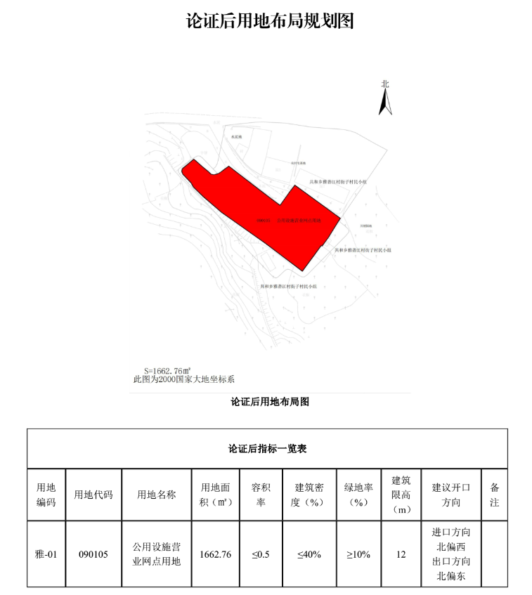 論證確定地塊編碼:雅-01。用地面積為1662.76m2,用地代碼090105(公用設(shè)施營業(yè)網(wǎng)點用地),容積率≤0.5,建筑密度≤40%,綠地率≥10%,限高12m,建議開口方向為進口方向北偏西,出口方向北偏東。