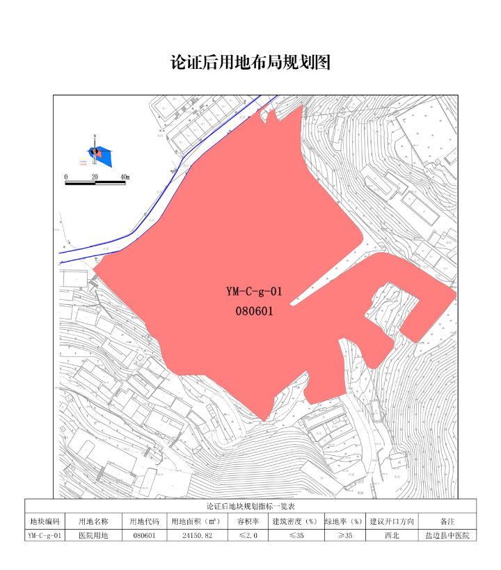論證后地塊編碼為YM-C-g-01,用地面積為24150.82㎡,用地代碼080601(醫院用地),容積率≤2.0,建筑密度≤35%,綠地率≥35%,建議開口方向西北。