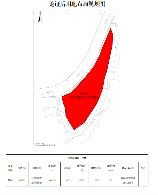 論證后:編碼為安-01,用地面積為4047.06㎡,用地代碼090105(公用設施營業(yè)網(wǎng)點用地),容積率≤0.3,建筑密度≤30%,綠地率≥20%,建筑限高12m,開口方向:進口方向西偏南,出口方向北。