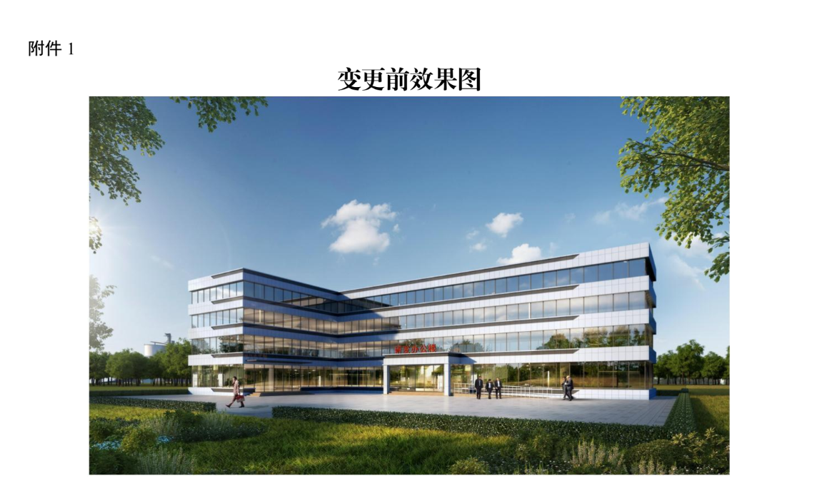 一、變更內容:研發辦公樓東、西、南三面二層至四層原設計灰色真石漆外墻面變更為碲化鎘光伏玻璃,一層由淺灰色真石漆變更成深灰色真石漆。