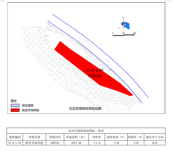 論證后擬確定用地地塊編碼為XJ-D-a-01,用地面積為3027.00㎡,用地代碼090102(批發市場用地),容積率≤1.0,建筑密度≤40%,綠地率≥20%,開口方向:東北。