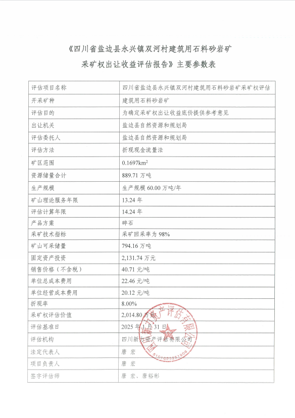 鹽邊縣自然資源和規劃局關于四川省鹽邊縣永興鎮雙河村建筑用石料砂巖礦采礦權出讓收益評估結果的公示