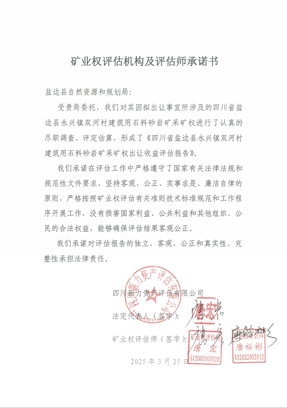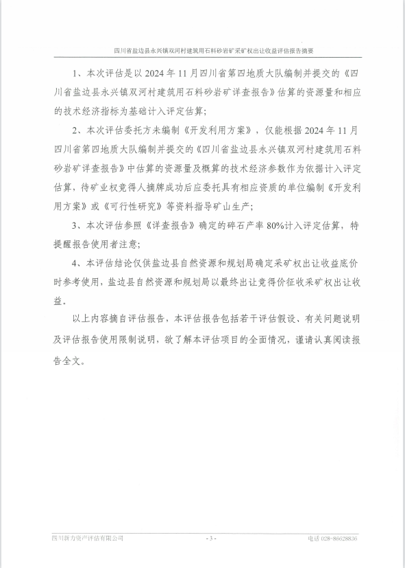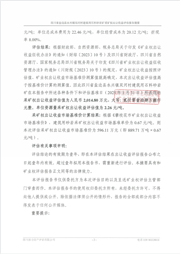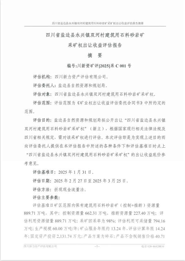 四川省鹽邊縣永興鎮雙河村建筑用石料砂巖礦采礦權出讓收益評估 |