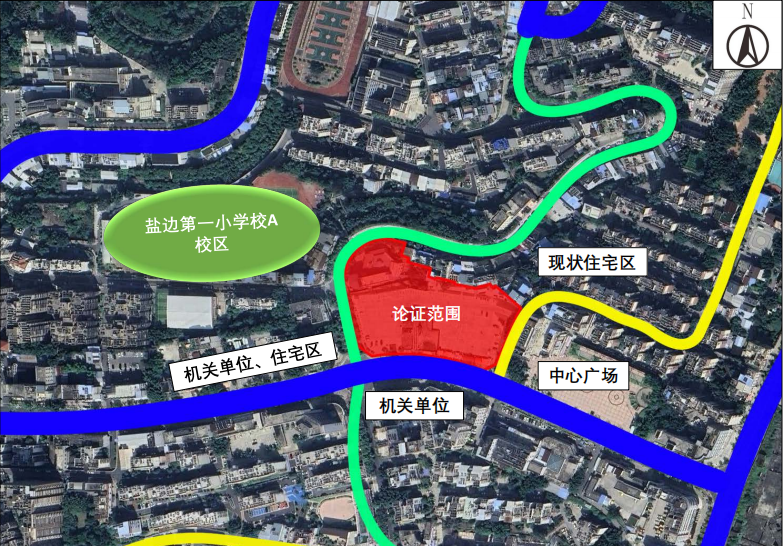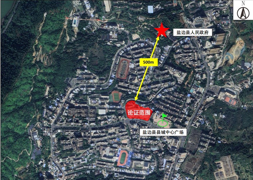 本次論證范圍位于鹽邊縣縣城中部核心區域,論證范圍東南側即為縣城中心廣場,與鹽邊縣人民政府直線距離約500m,南側毗鄰縣城主干道,西側和北側毗鄰縣城次干道,東側毗鄰縣城支路,通過上述道路均可通往至國道(227)和縣城其他區域,對外、對內交通便捷,交通條件良好。論證范圍西北側為鹽邊第一小學校A校區、西側為機關單位辦公樓和居民住宅區,南側為機關單位辦公樓,東側為中心廣場。