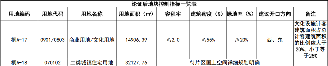 論證后地塊一編碼為桐A-17,用地面積為14906.39㎡,用地性質為商業用地/文化用地,用地代碼:0901/0803,容積率≤2.0,建筑密度≤55%,綠地率≥20%,建議開口方向:西側、東側、南側。