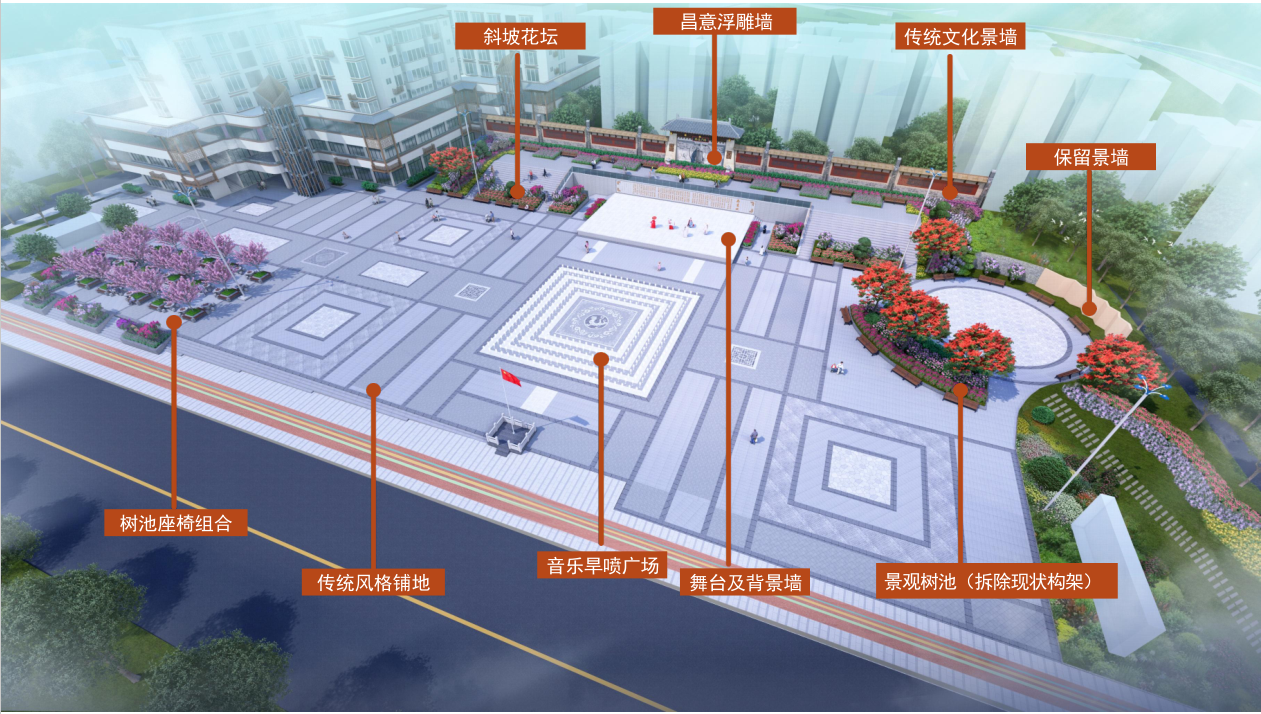 對中心廣場和晨宇大廈周邊約7000平米的鋪裝地面進行提升改造,改造晨宇大廈外立面和屋面防水,改造文化景墻等,具體效果圖詳見附件。