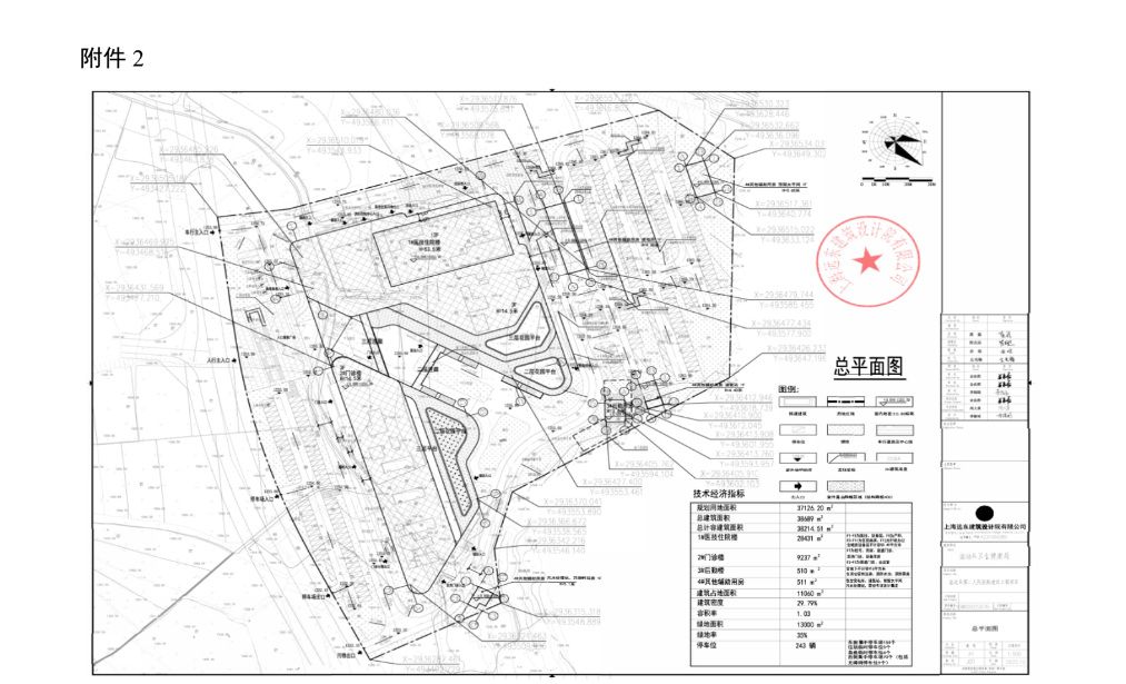 總規劃用地面積37126.20m²,總建筑面積為38689m²(其中醫技住院樓28431m²,門診樓9237m²,后勤樓510m²,其他輔助用房511m²);建筑占地面積11060m²,建筑密度29.79%;計容建筑面積38214.51m²,容積率1.03;綠地面積13000m²,綠地率35%;機動車位243個。
