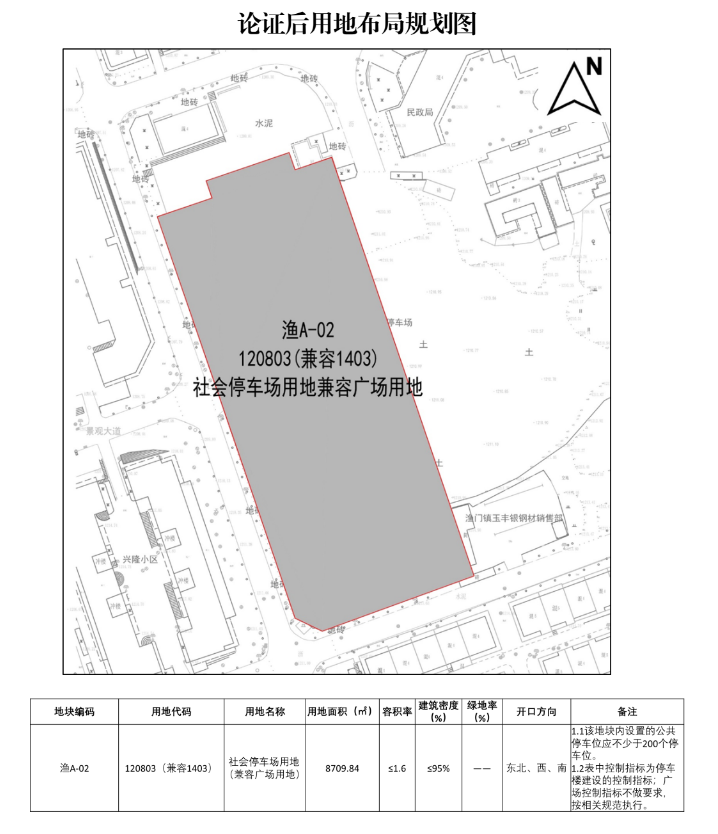 論證確定地塊用地編碼為A-02,用地面積為8709.84㎡,用地代碼為120803(社會停車用地)兼容1403(廣場用地),容積率≤1.6,建筑密度≤95%,開口東北、西、南,設置不少于200個公共停車位。