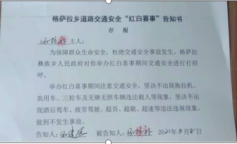 為切實保障人民群眾生命安全,強化道路交通安全管理工作。鄉黨委政府高度重視,一是結合對本地農村道路、氣候、基礎設施等全面摸排情況,深入剖析歷年發生的交通安全事故案例,針對性的進行了交通安全形式研判。二是結合本地民風民俗和特殊情況,因地制宜積極探索新方法新思路,及時研究部署切實有效的管理措施。三是在婚喪嫁娶、紅白喜事等重點時段,鄉村兩級聯合以交通安全“打招呼”的形式,向酒席負責人簽發“格薩拉鄉紅白喜事交通安全告知書”,落實其交通安全管理主體責任,強化了交通安全管理措施,有效防范和遏制了群死群傷和重大交通安全事故發生。
