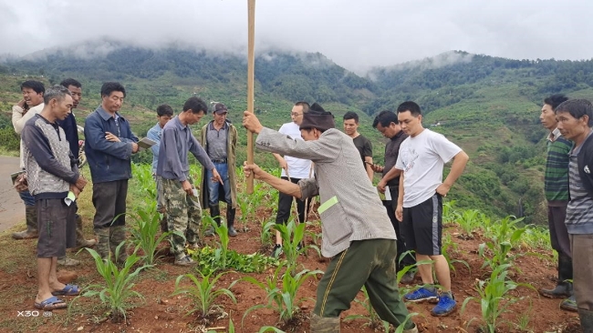 圖為蠶桑專家謝成德對標準化桑園種植進行培訓、對蠶桑種植技術(shù)進行培訓,發(fā)放蠶桑標準化種植技術(shù)書籍40本。