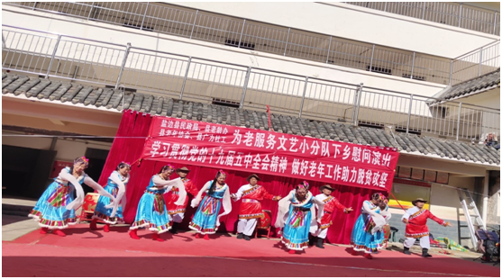 2020年,11月18日,由縣民宗局、縣老齡辦、縣老年協會、縣廣力社工組織的“為老服務文藝小分隊下鄉慰問演出,學習貫徹黨的十九屆五中全會精神,做好老年工作主力脫貧攻堅”活動在惠民鎮銀河社區養老院進行,一大早,演員們精神抖擻,準備化妝、布置舞臺、準備水果和水分給老人們,敬老院的老人們也穿戴整齊,異常開心,在敬老院工作人員的有序組織下有序入座。10點整,所有的準備工作就緒,由惠民鎮副鎮長韋美男說祝詞,活動開始。