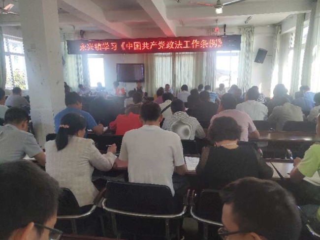 2020年4月21日上午, 永興鎮組織學習《中國共產黨政法工作條例》,會議由鎮黨委書記陳強華同志主持。鎮機關全體干部職工、各村(居)支部書記、村民委員會主任共100余人參會。鎮分管政法工作的黨委副書記董潮桂同志認真傳達學習習近平總書記在中央政法工作會議上的重要講話精神,組織學習《中國共產黨政法工作條例》原文。同時就《條例》出臺的背景、重大意義、主要內容等方面做了重點解讀。并對當前信訪、維穩、禁毒、反邪教、掃黑除惡專項斗爭、網格化、嚴重精神障礙患者、安置幫教工作、民族宗教等工作進行安排部署。