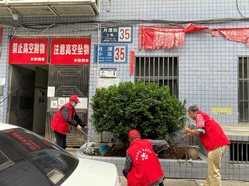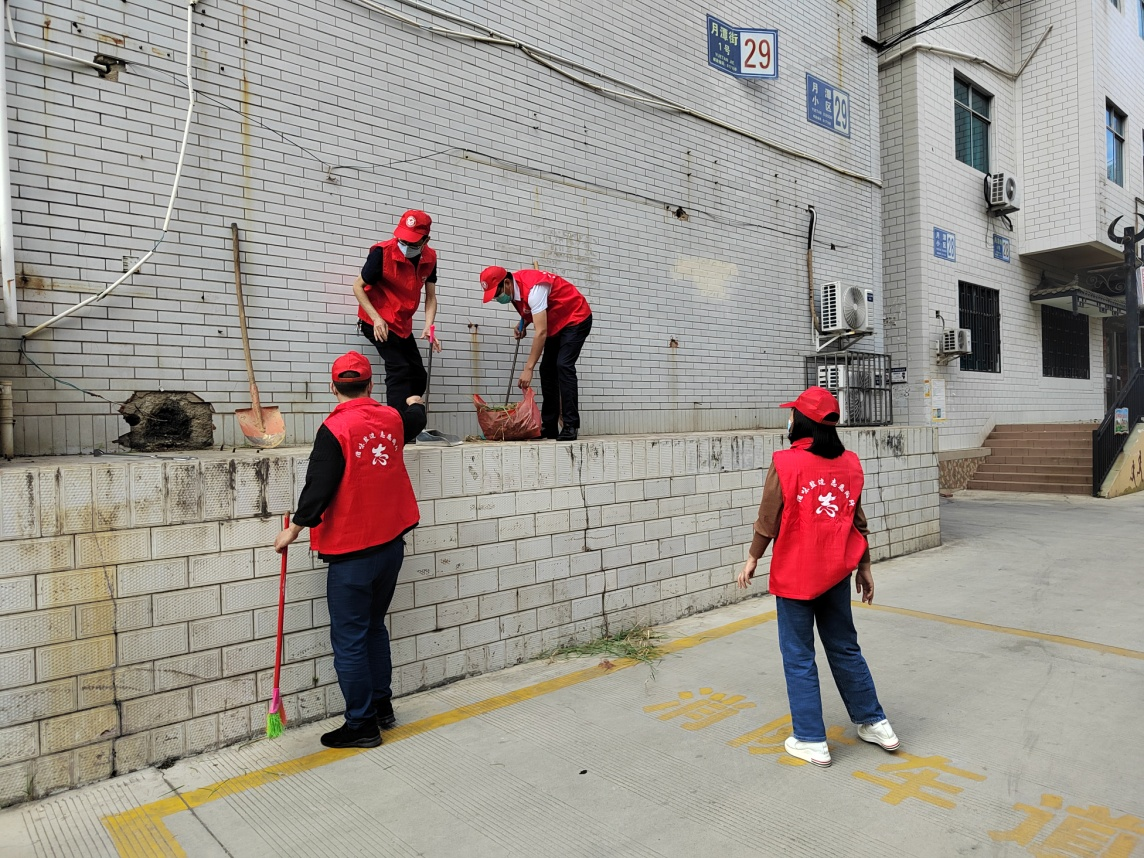 志愿小分隊對月潭小區包保樓棟及周邊進行衛生清掃