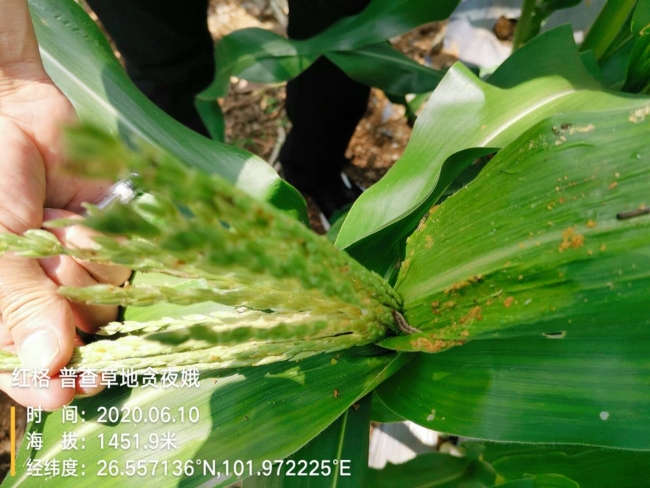 隨著雨季來臨,夏玉米陸續出苗。有水源保障的區域,夏玉米已進入拔節期。苗期至拔節期是玉米易受草地貪夜蛾危害的適宜生育期。6月4日至10日,我局植物檢疫站工作人員在惠民鎮、永興鎮、紅格鎮、新九鎮等地隨機對玉米地草地貪夜蛾發生情況進行了調查,共調查12個點,303.8畝;有7個點、16.4畝發生草地貪夜蛾,占總調查面積的5.4%,被害株率15%-78%;被害株率最高的是永興鎮箐河村二社調查點(6.8畝),百株蟲量達32頭,心葉被害嚴重。處于苗期的夏玉米從低山河谷區(惠民鎮民主村)到高山區(永興鎮箐河村、紅格鎮勝利村)均不同程度地受到草地貪夜蛾的危害。值得注意的新情況是,紅格鎮昔格達村310復線路邊一玉米地雄穗剛剛露頭,遠看無明顯被害狀,撕開雄穗后,地貪夜蛾幼蟲正在危害。該地塊被害株率達24%,危害部位已不是心葉而是雄穗。各鄉鎮在田間調查時,一定要加強對雄穗被害情況的監測。