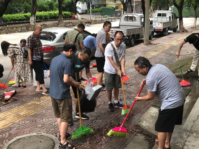 活動中,我局干部職工一方面仔細清掃路邊人行道落葉、煙頭、雜草、紙屑等垃圾,另一方面清掃無人打掃的商戶門前。
