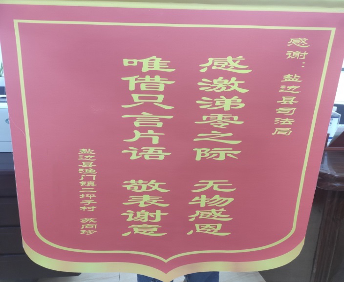 “公平正義促和諧,法律援助解民憂”4月19日,鹽邊縣司法局法律援助中心收到一面群眾送來致謝錦旗,而這是該局本月收到的第三面錦旗。自政法隊伍教育整頓和黨史學習教育工作開展以來,鹽邊縣司法局積極將學習教育成果轉化為工作實效,扎實開展“我為群眾辦實事”實踐活動,以小調解、辦小事、幫小忙為抓手,積極為群眾辦好事、辦實事,解民憂、化民愁。