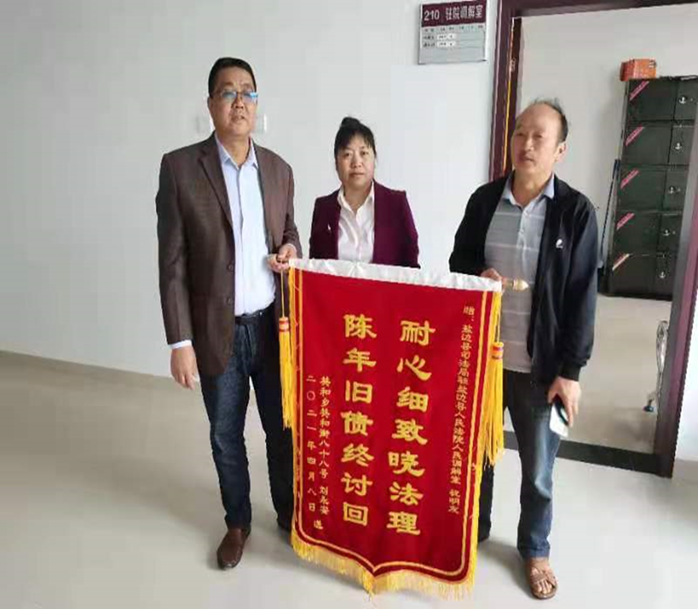 調解員在詳細了解案情始末及矛盾癥結后,決定采用“背對背”的調解方式,從情、理、法多角度去做雙方工作。調解員一方面向駱某某擺事實講道理,告知他不履行該筆長期拖延未付的勞動報酬,已違反勞動法相關規定。另一方面,安撫劉某某的情緒,讓其耐心等待,力求矛盾糾紛圓滿化解;2021年4月8日,經過調解員不懈地努力,最終雙方達成協議,成功化解了這起長達8年的勞務合同糾紛,駱某某于當天支付了拖欠劉某某的全部勞務工資。當天,劉某某便將一面精心制作的錦旗送到調解員手中,對調解中心真誠、耐心、細致地幫其解決糾紛表達感激之情。