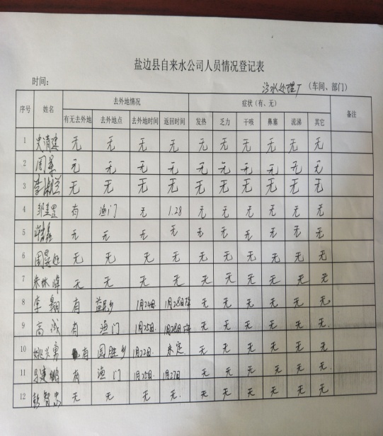 縣城污水處理廠建立每日上下班人員體溫管控臺帳。